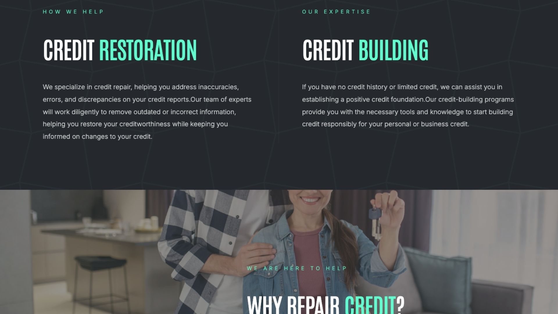 Credit Replenish is a financial services company requiring a landing page that emphasized trust and clarity for their credit repair services. The goal was to create a professional Carrd.co site with engaging visual effects that built credibility while maintaining fast load times.