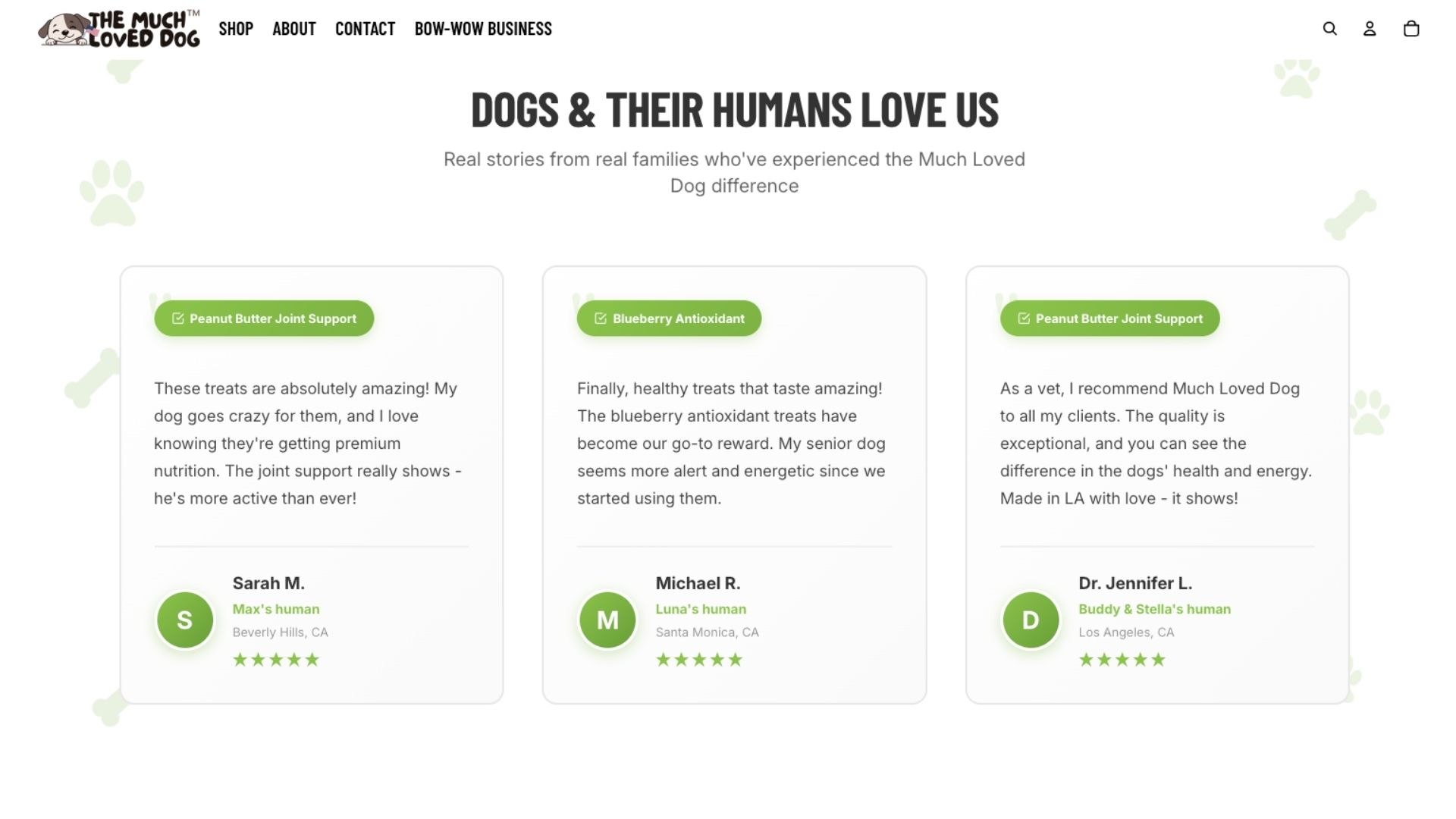 I built a mobile-optimized Shopify theme featuring a custom-coded testimonials section, playful paw-print design elements throughout the site, and a comprehensive product tag system for easy navigation and filtering.