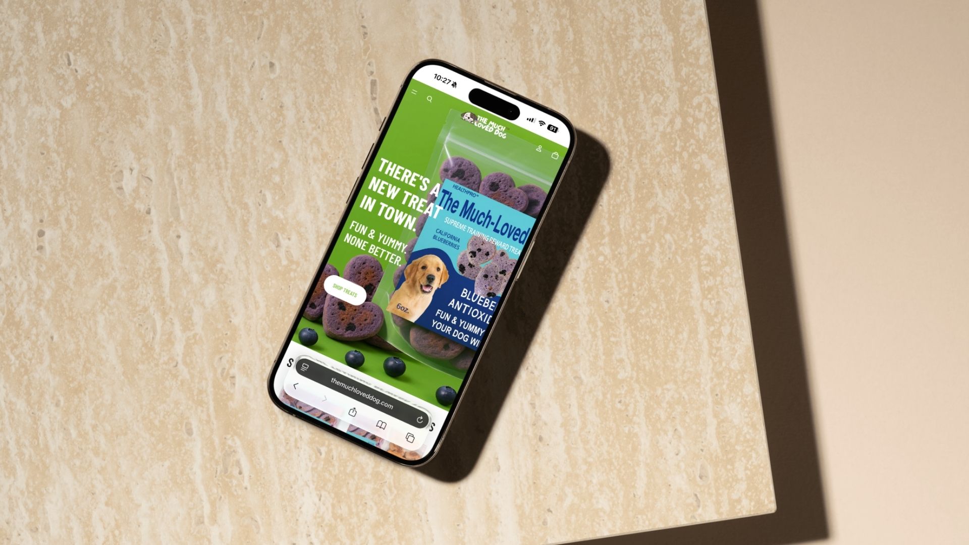 Premium dog treat brand with mobile-optimized Shopify experience featuring custom code, clean product design, and vibrant visuals.